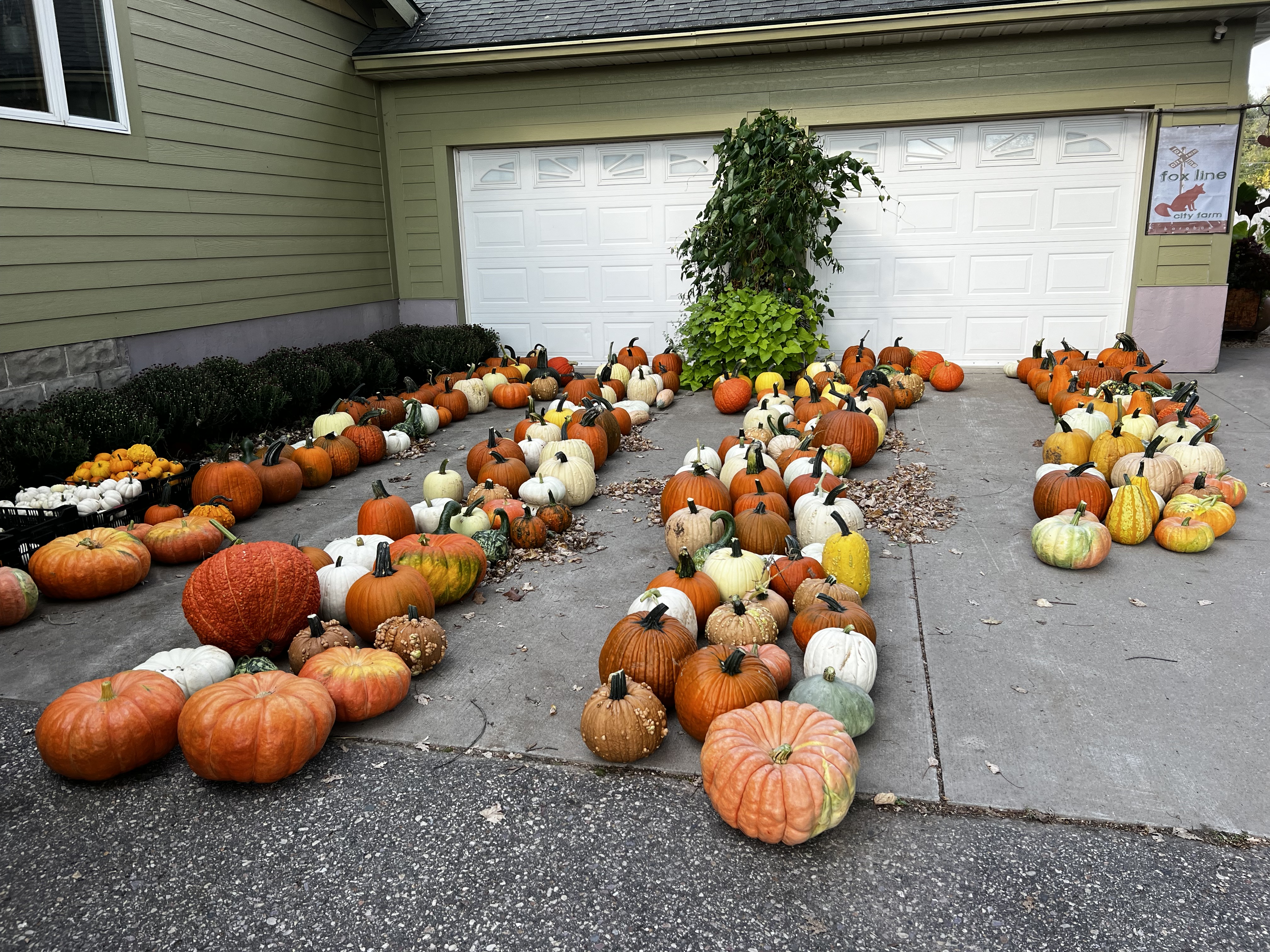 Pumpkins-Quite the Haul! All lined up and ready in the driveway again this week for CSA members to select a favorite.