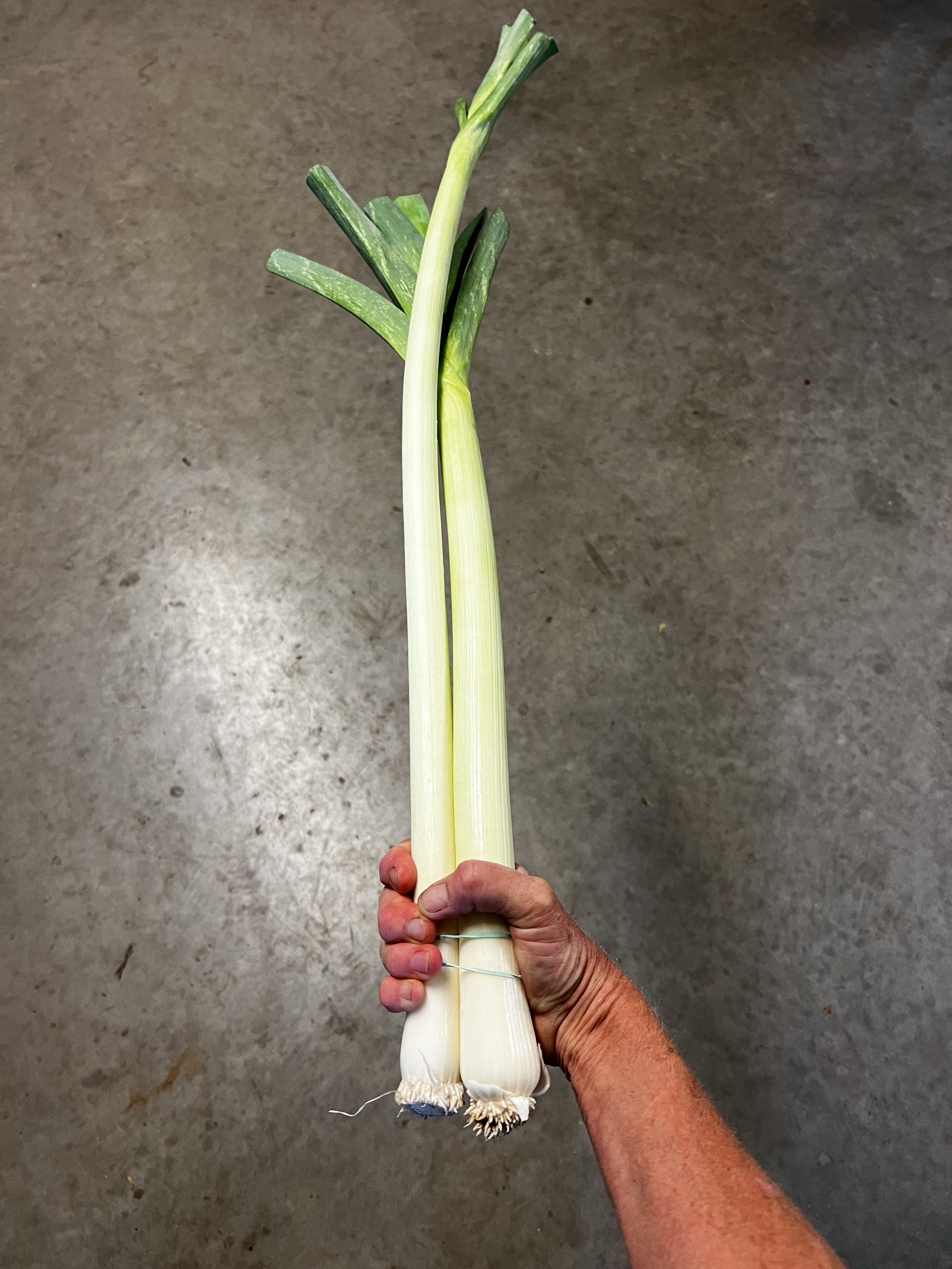 Leeks-Our helper Al pulled the last of the leek crop from the garden this past week and we trimmed and cleaned them up in the shade. Longest we have ever grown.