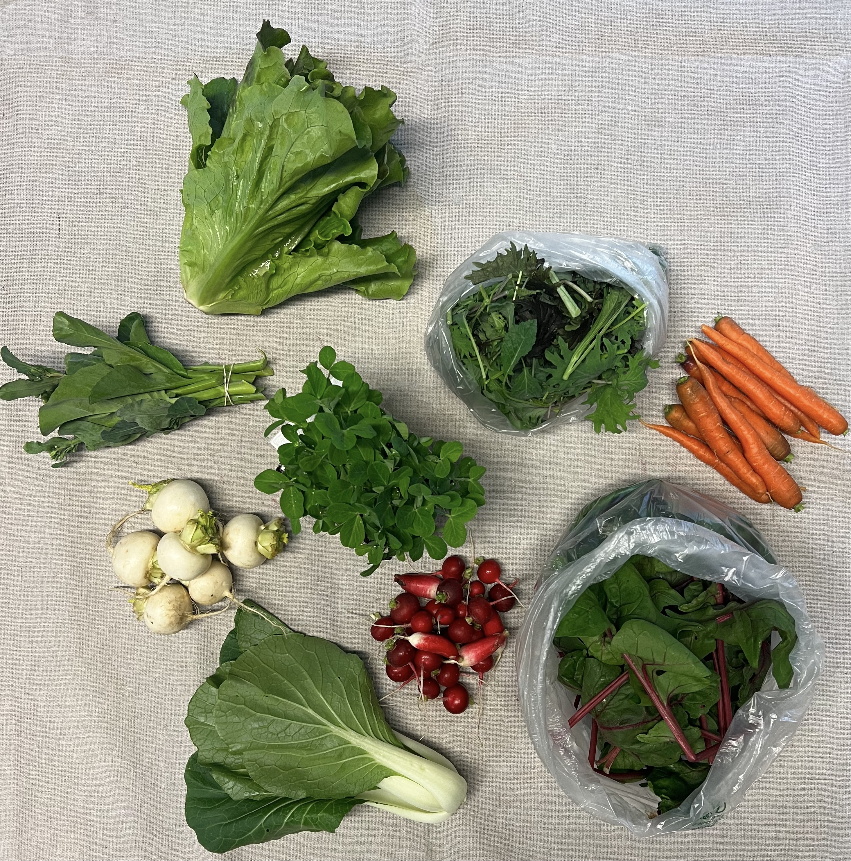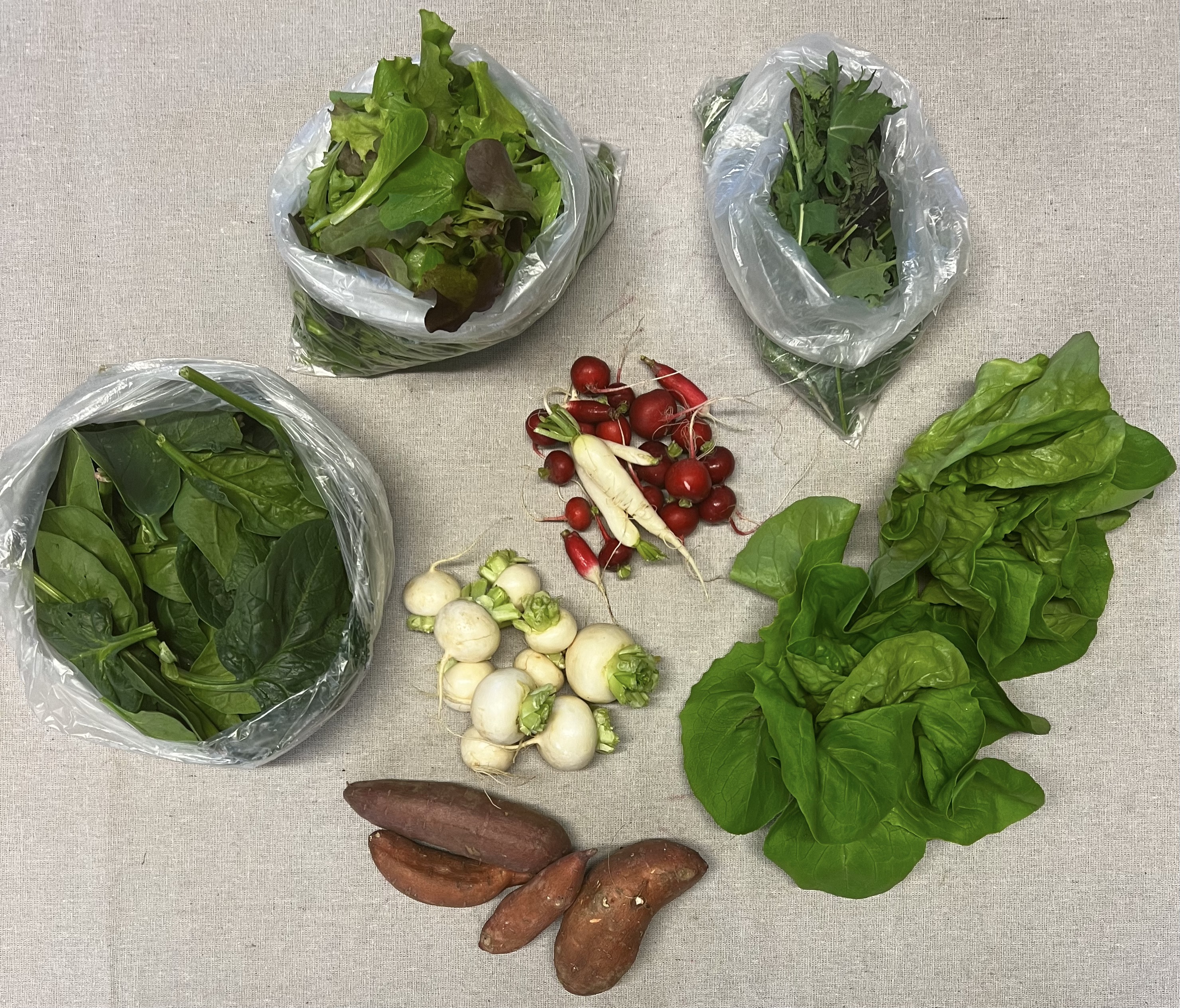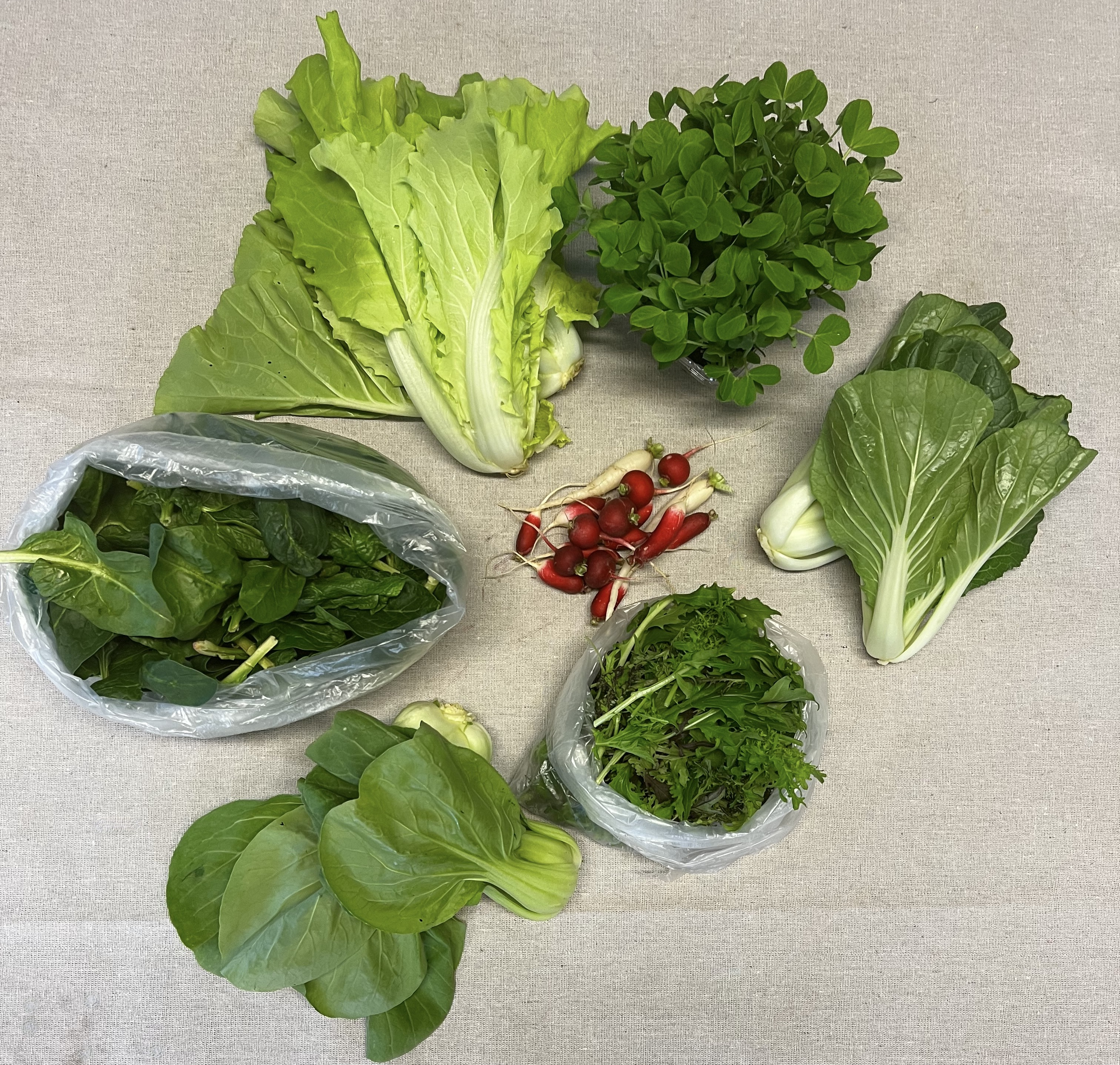 SPRING SHARE 2024–4 consecutive weeks of cool-loving crops from our hoop houses starting in May. A green lovers delight! The share will include 6-10 different offerings each week. Tons! of Spinach, head lettuce, salad mix, saute mix, sunflower shoots, pea shoots, micro greens, arugula, salad turnips, radishes, baby carrots, pac choi, asian greens, and more! A delicious treat after the long cold winter!! Produce is clean, carefully packaged, and stored in our walk-in cooler until the time of pickup. $165.00 ($41.25 week)