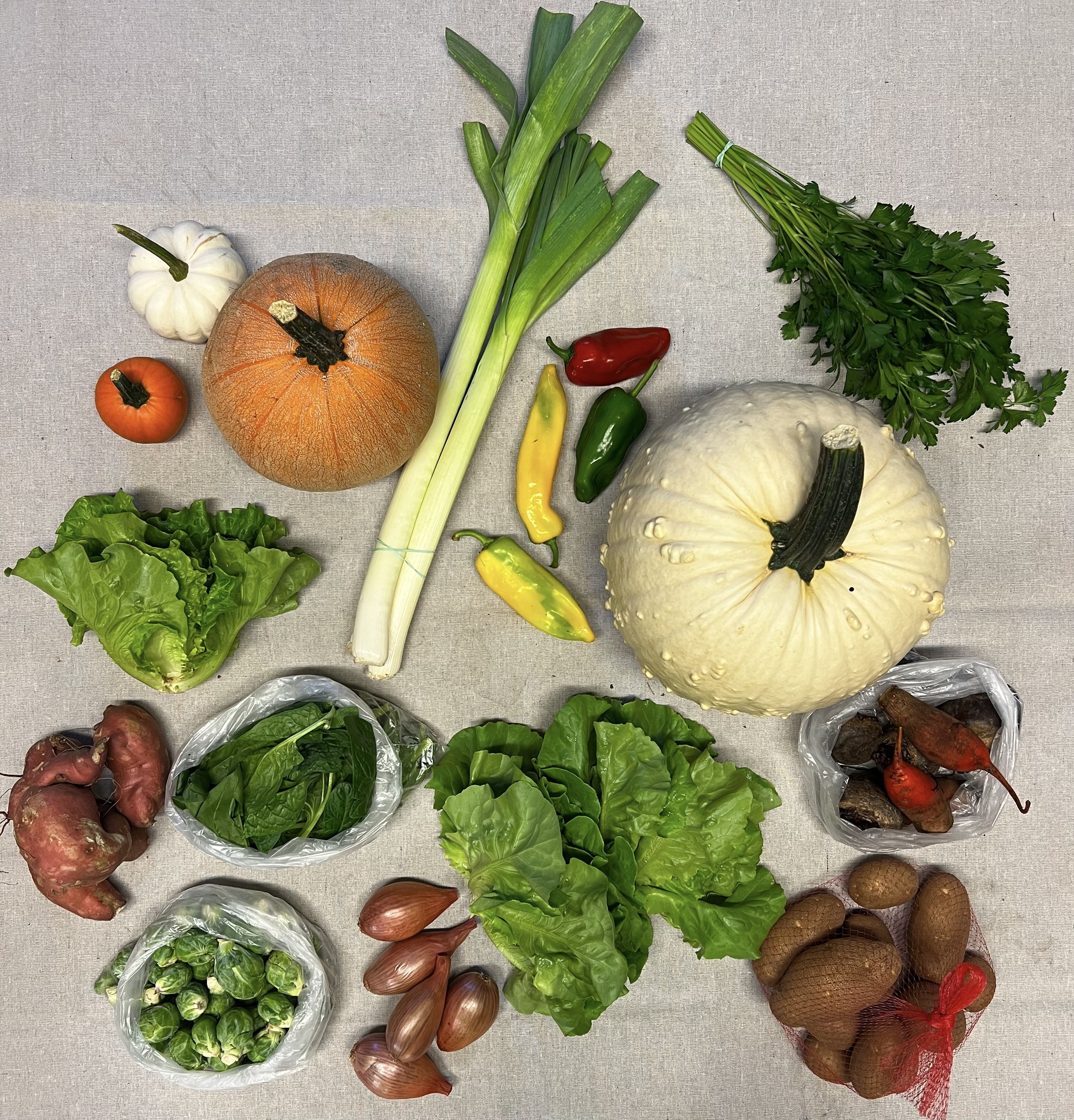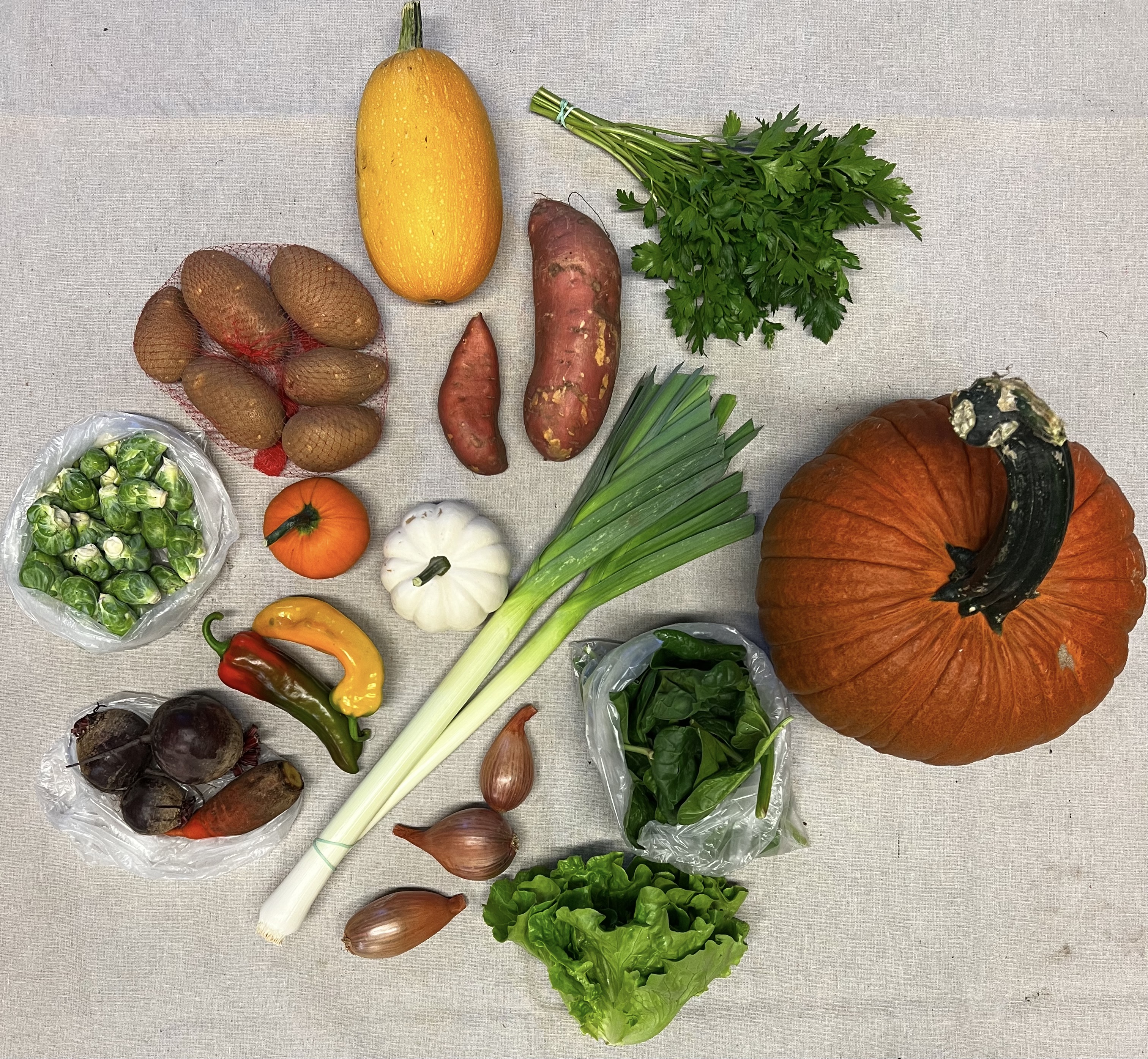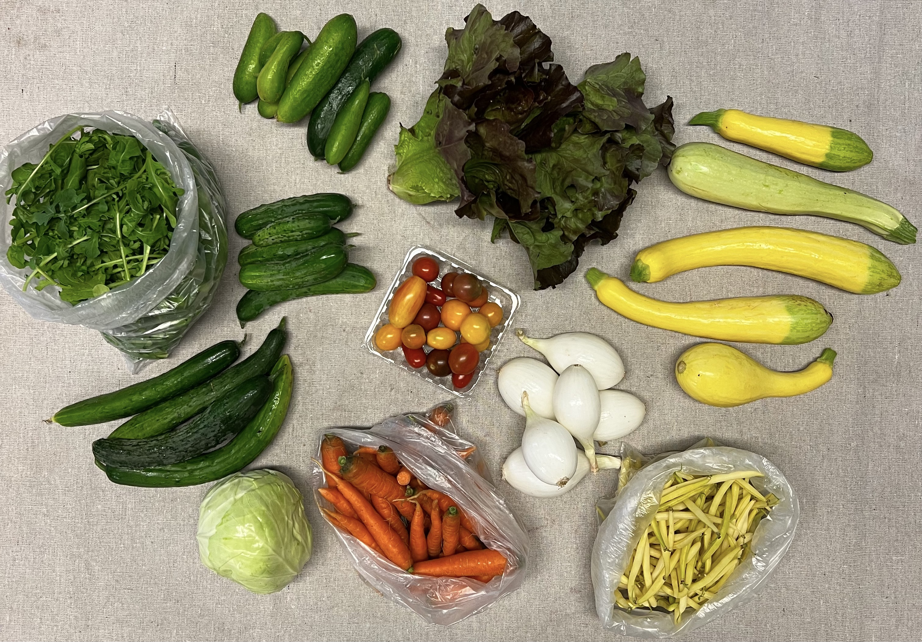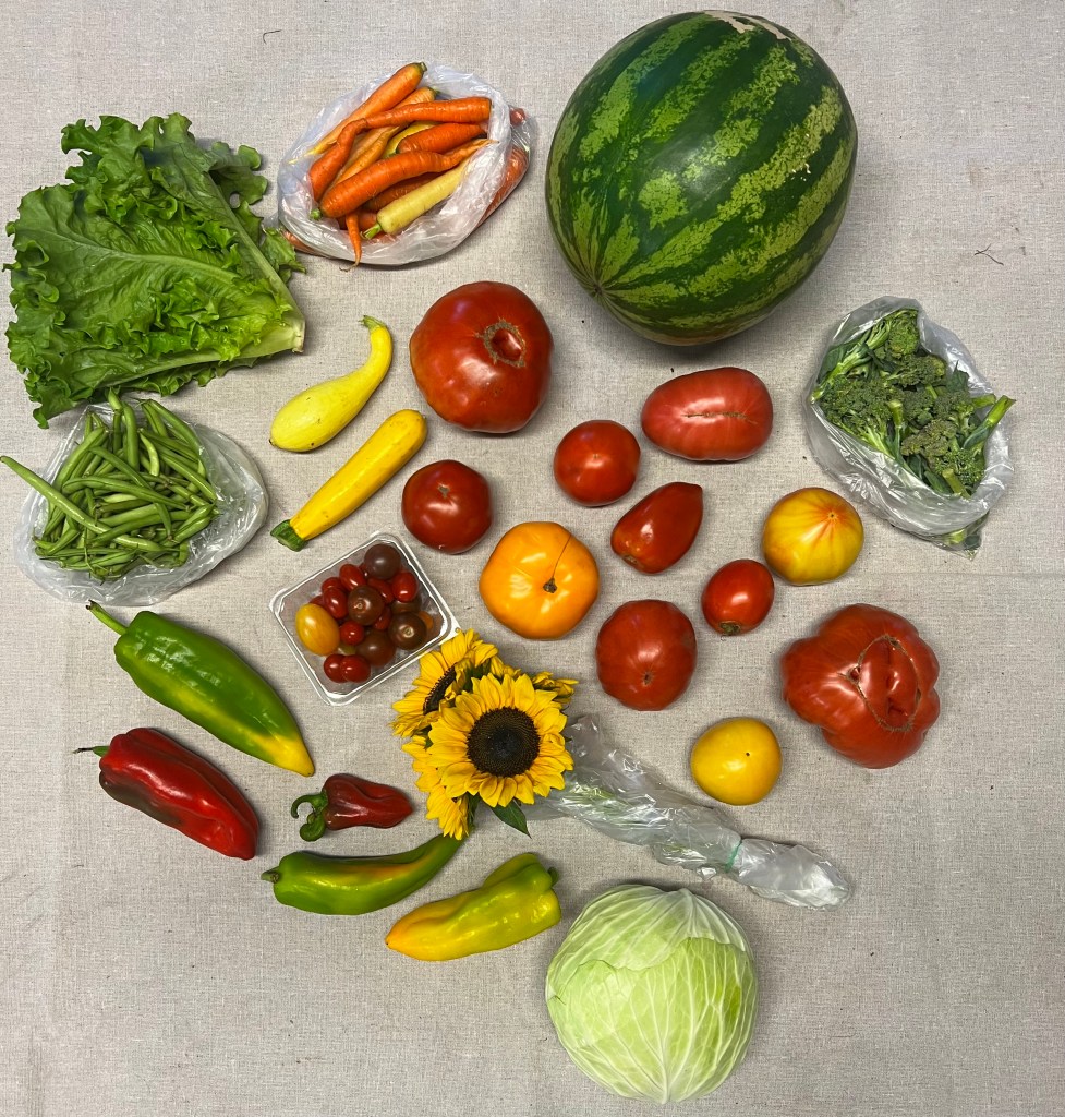 Full Share-18 consecutive weeks starting in June. A perfect share for a family or couple that cooks most weekly meals at home. Feel free to share a share with another family and split the bounty weekly or every other week. Weekly offerings of seasonal produce all summer long. Tons of leafy greens!, spinach, lettuce, salad mix, saute mix, basil, asian greens, pac choi, swiss chard, celery, rhubarb, radishes, carrots, beets, summer squash, winter squash, spaghetti squash, cucumbers, beans, peas, broccoli, cabbage, edamame, potatoes, sweet potatoes, tomatoes, melons, eggplant, peppers, brussels sprouts, onions, leeks, shallots, garlic, turnips, flowers and more…..Produce is clean, carefully packaged, and stored in our walk-in cooler until the time of pickup. $760 ($42.20 a week)