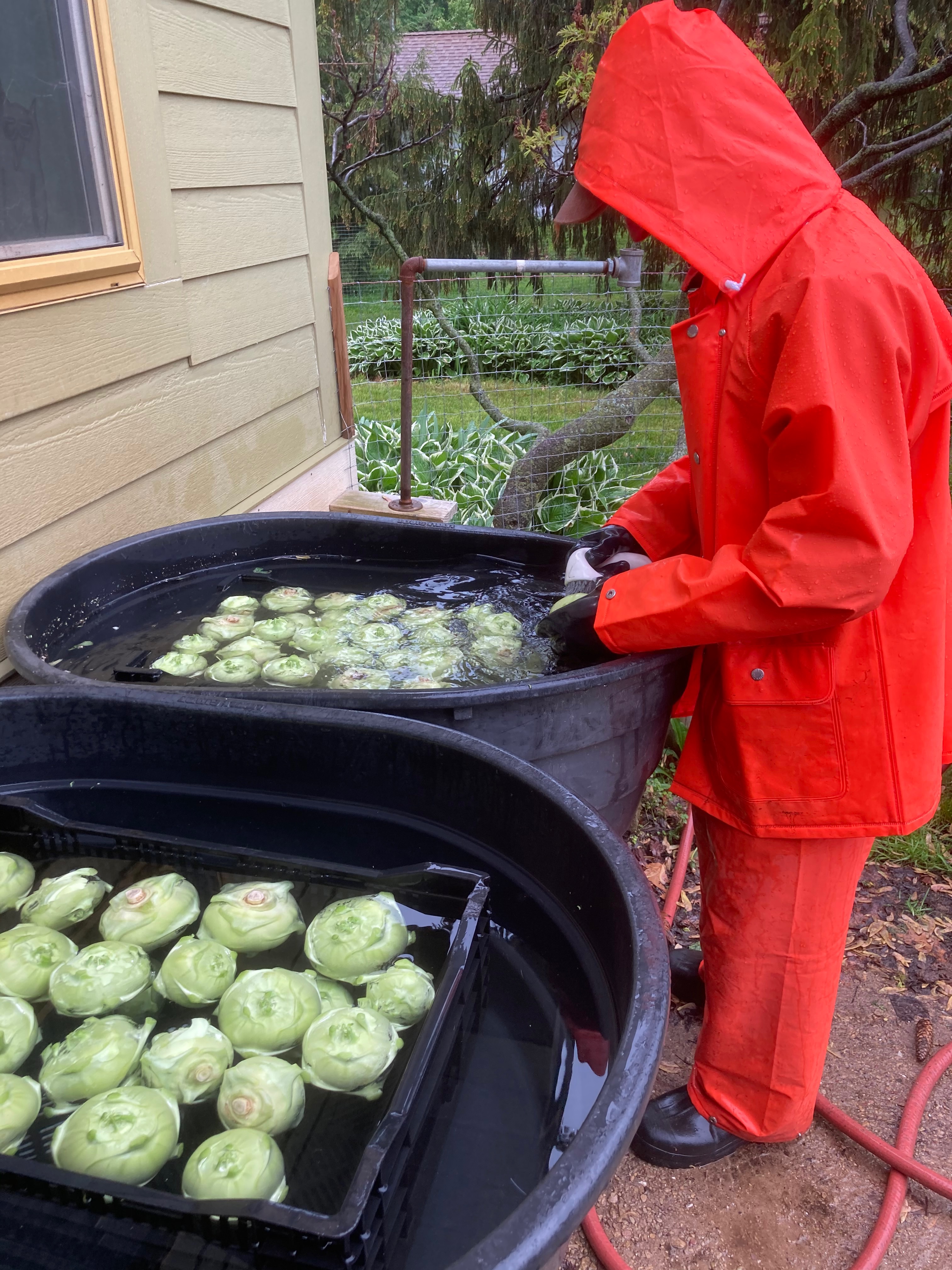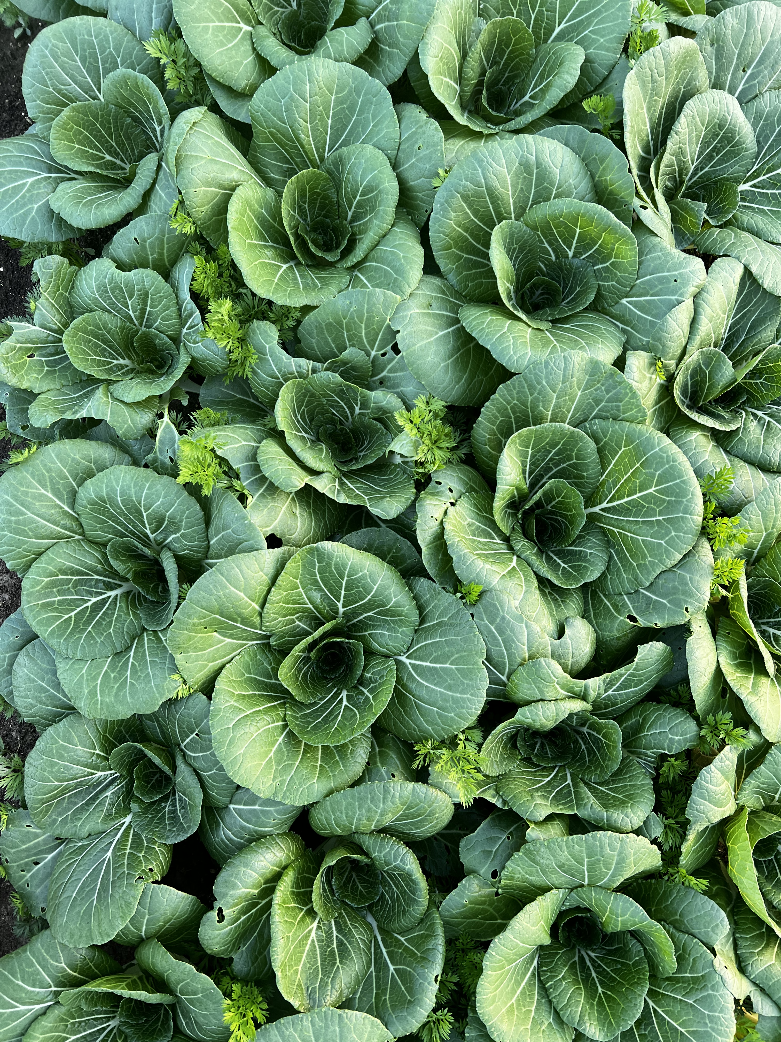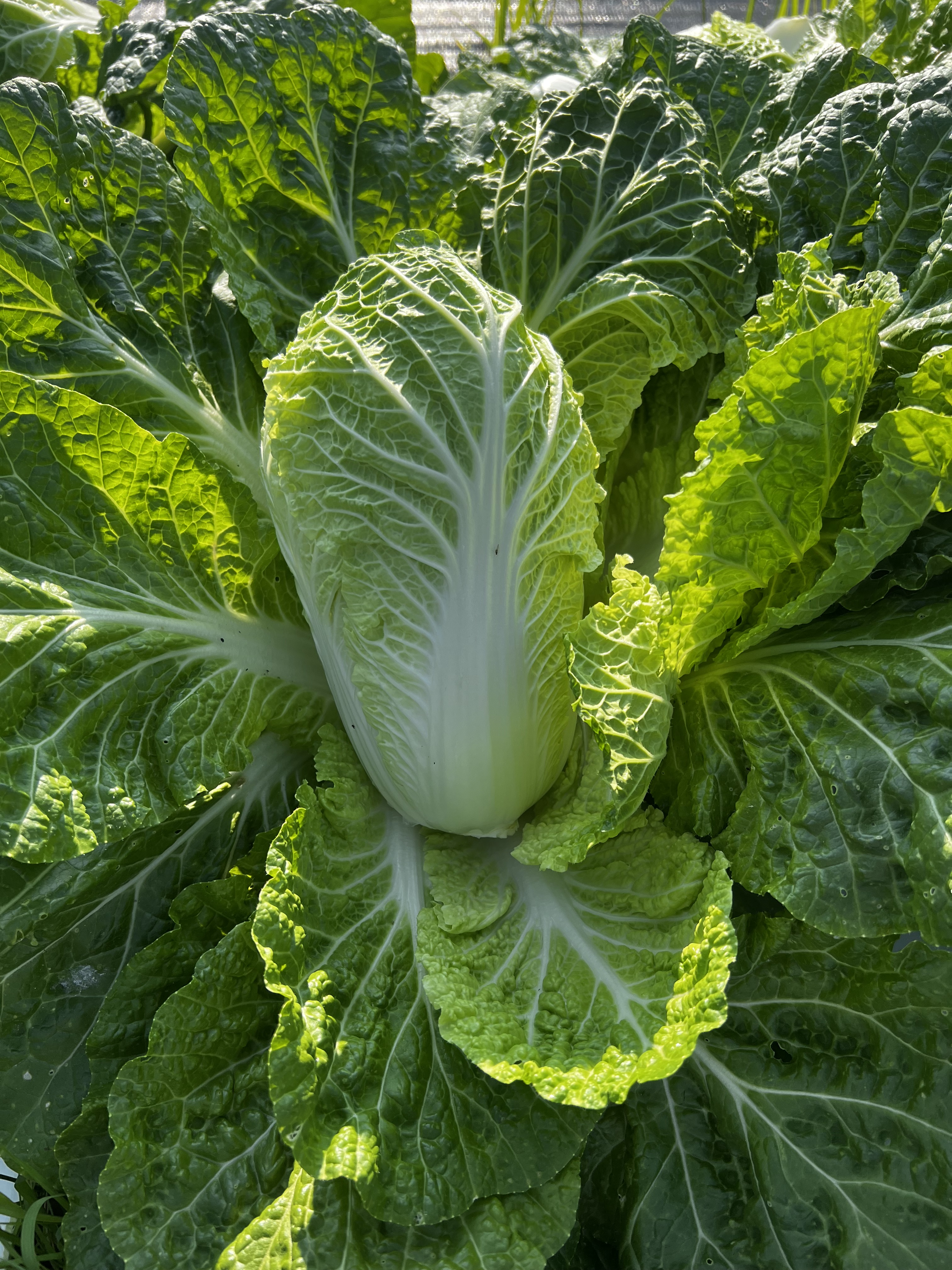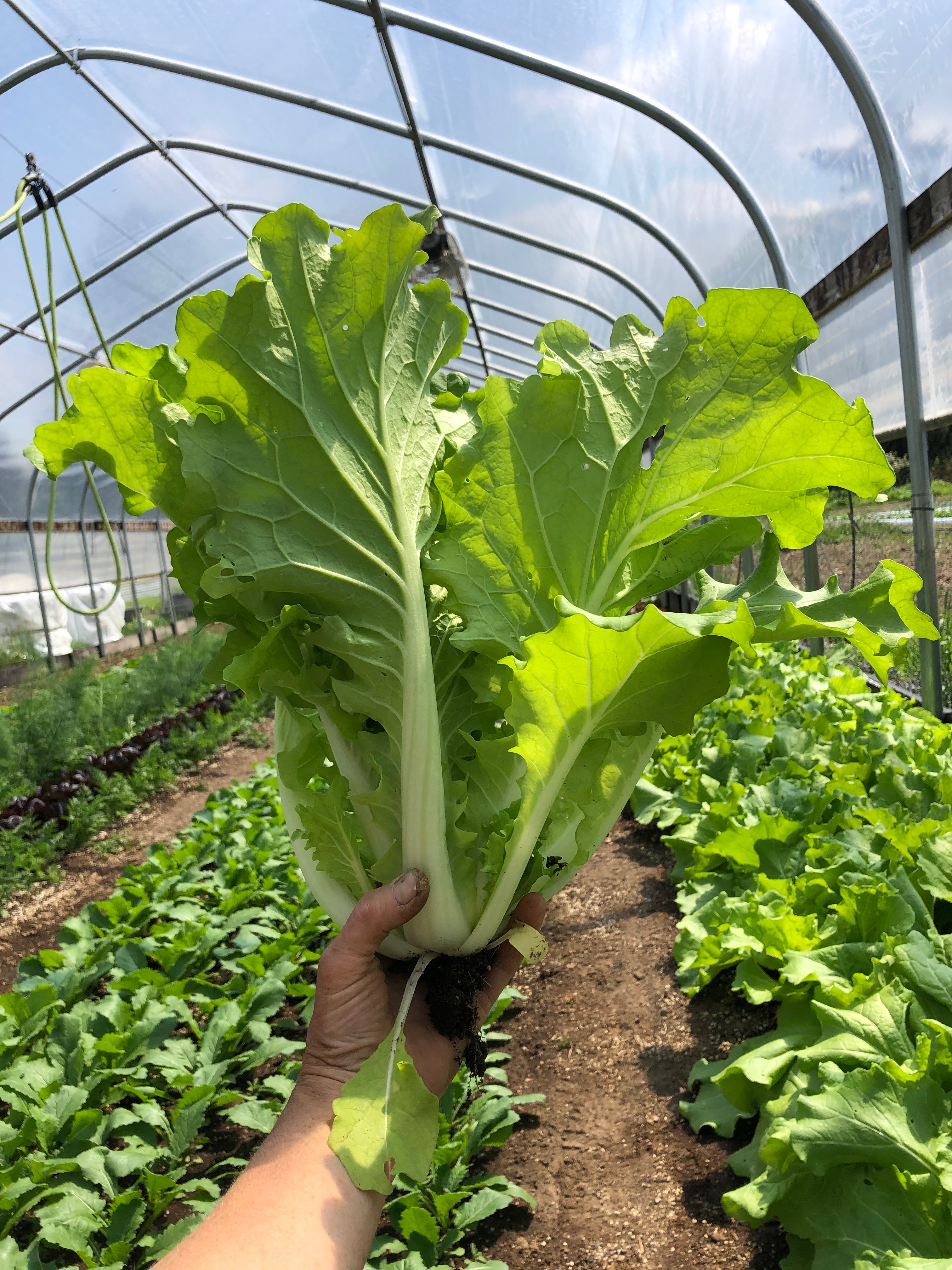 Chinese Cabbage-Here is a little garden magic! We took a risk and transplanted Chinese cabbage in late March in hoop 2. Chinese Cabbage is fussy and does not like temperature fluctuations nor temperatures below 55. Springtime temperatures are all over the place and nighttime temps dip low. Chinese Cabbage will often bolt in Spring and never head up. We decided to give it a shot and we harvested delicious perfect heads this week. Enjoy! Makes great coleslaw, we love it wilted and a warm side dish. Also, wonderful in stir fry and fresh in salads.