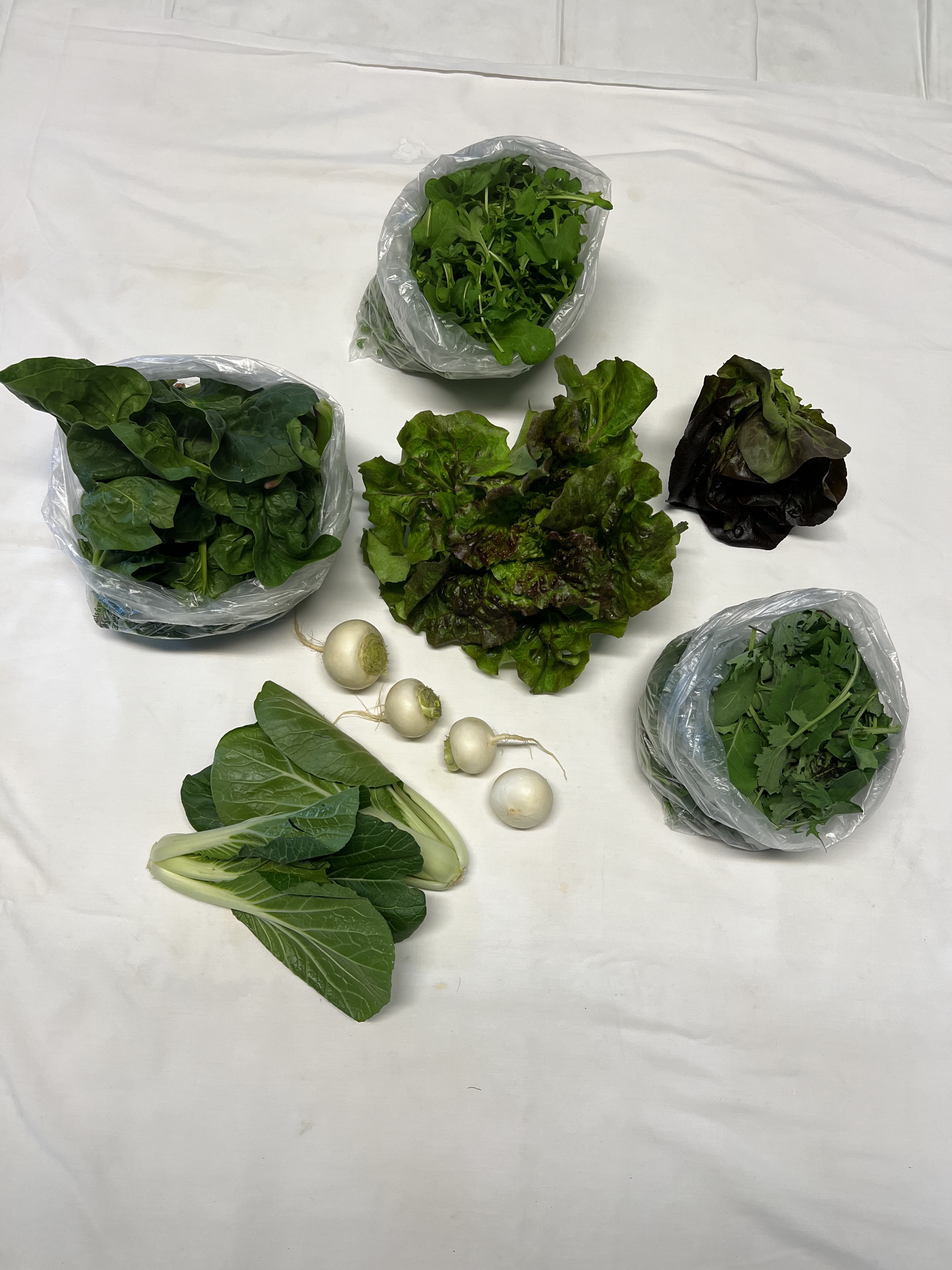 WHAT IS IN YOUR SHARE-head lettuce 2 varieties, turnips, arugula, baby kale mix, spinach, pac choi