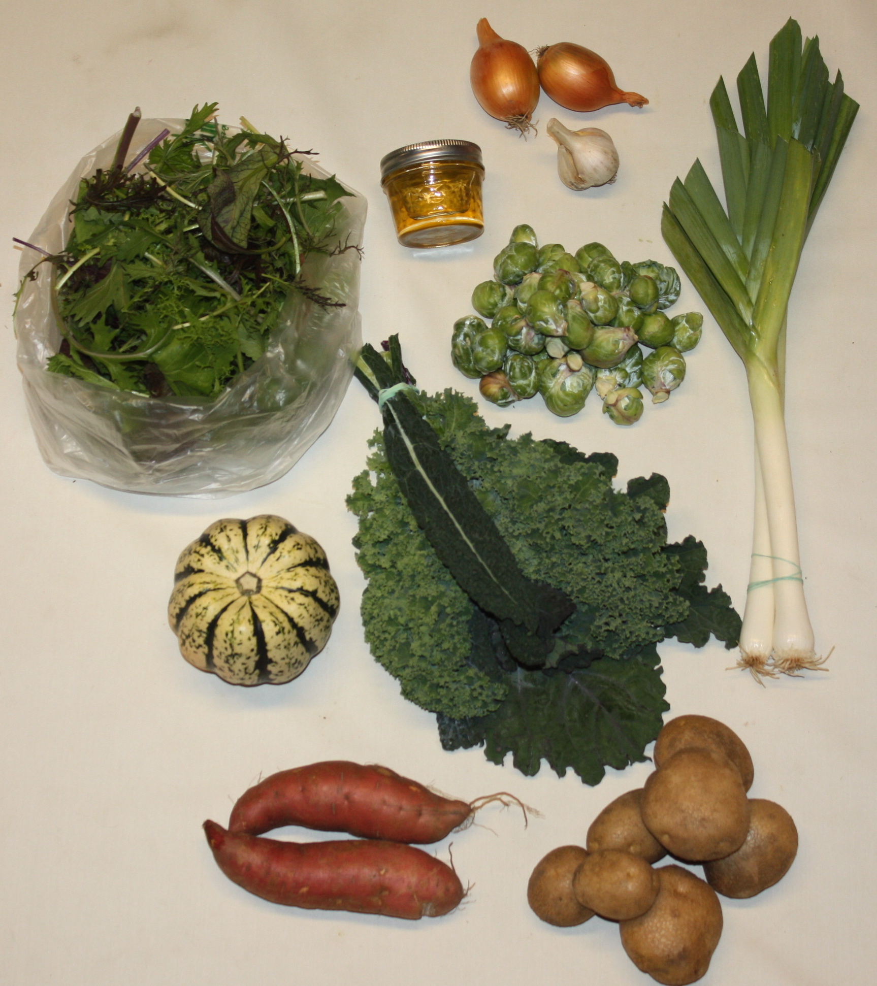 Winter Squash-A medley of acorn, carnival and butternuts. Soups, roasted or I add the puree to biscuits and pancakes in the morning.