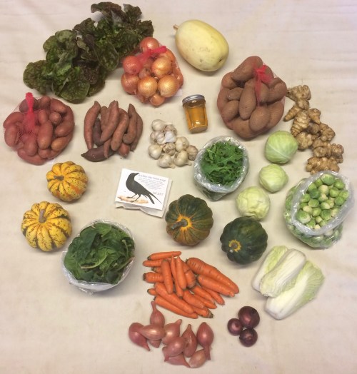 The final share of the 2017 season. A dusting of snow on the ground this morning after the balmy temperatures of late Fall. It seems an almost a symbolic end to the season today as the ground is freezing and we can do no more in the gardens. Our clean up is complete, and the gardens are put to bed. A first around here-ever!