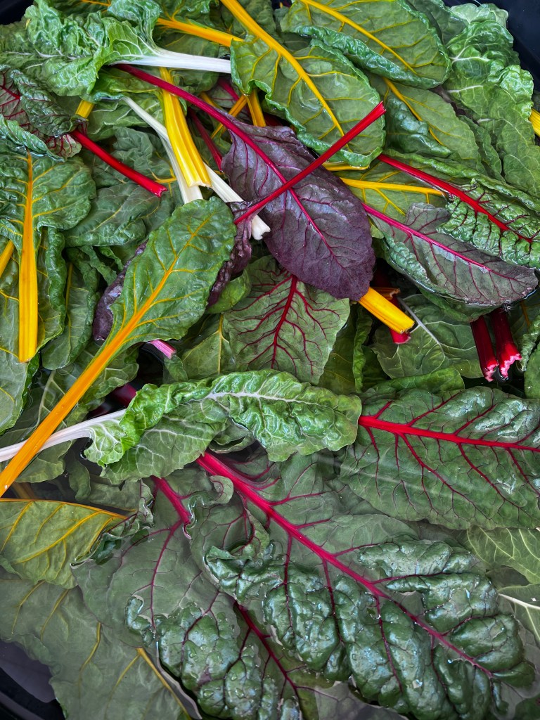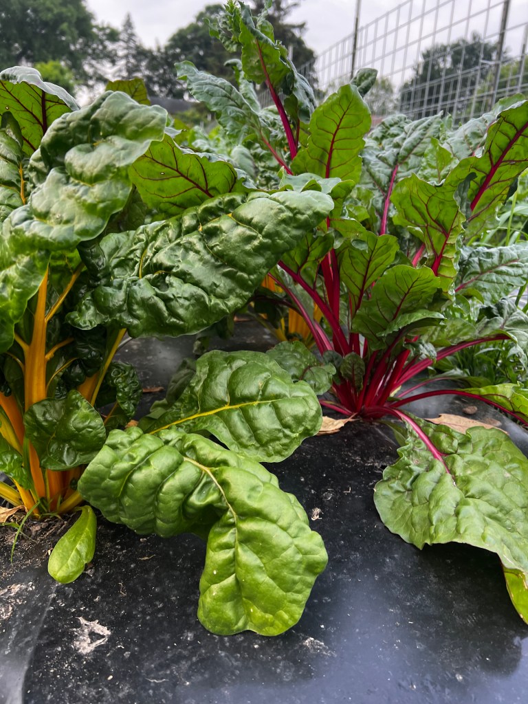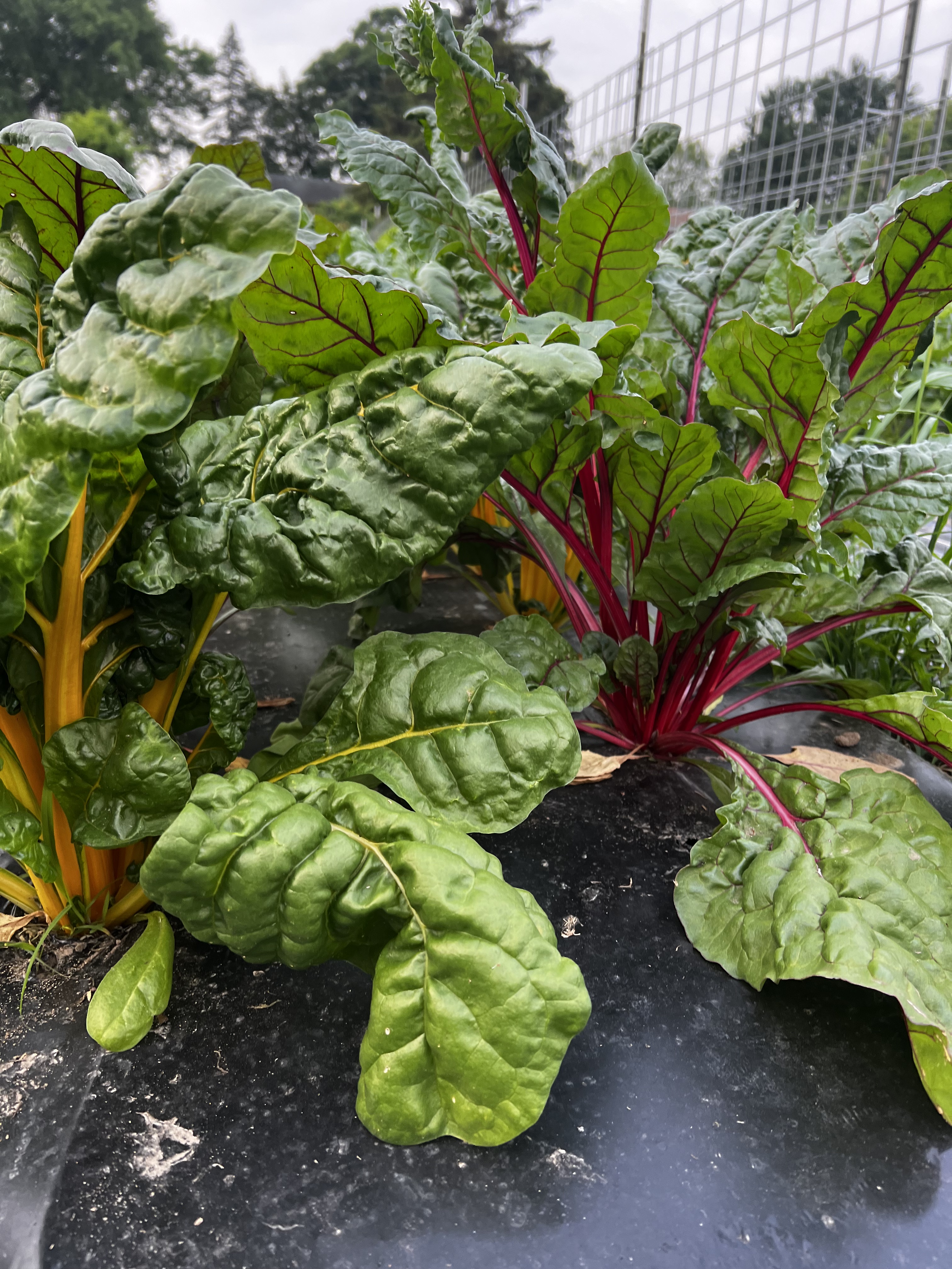 Swiss Chard-We had a great harvest of these tender stems. Scrambled eggs and chard are a breakfast treat. Also a quick saute with garlic scapes and onions and a splash of soy sauce is a perfect summertime side dish.