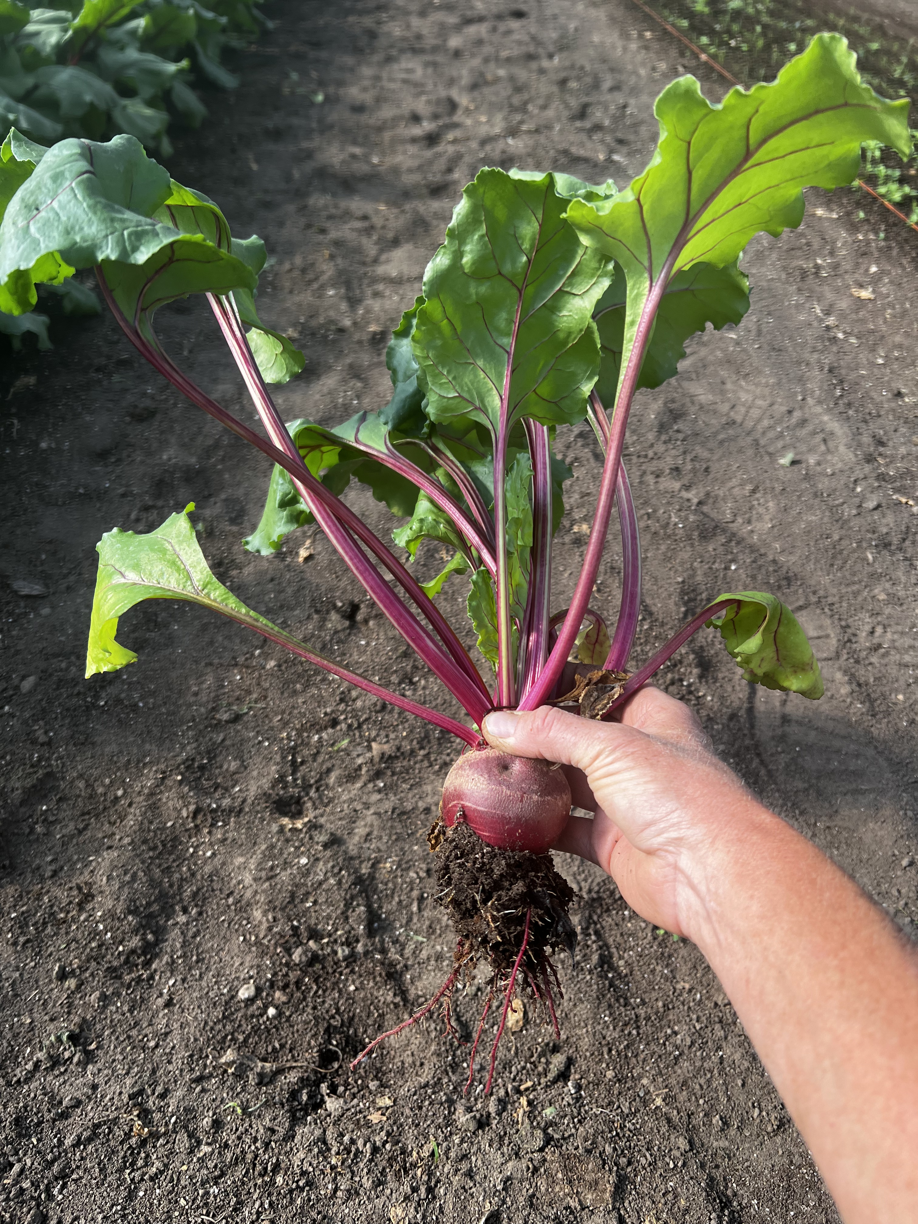 Beets-These beauties were started early in our greenhouse in individual cells and transplanted out into hoop 2 for an early harvest. Delicious. Sweet flavor as they grew slow and in cooler temperatures.