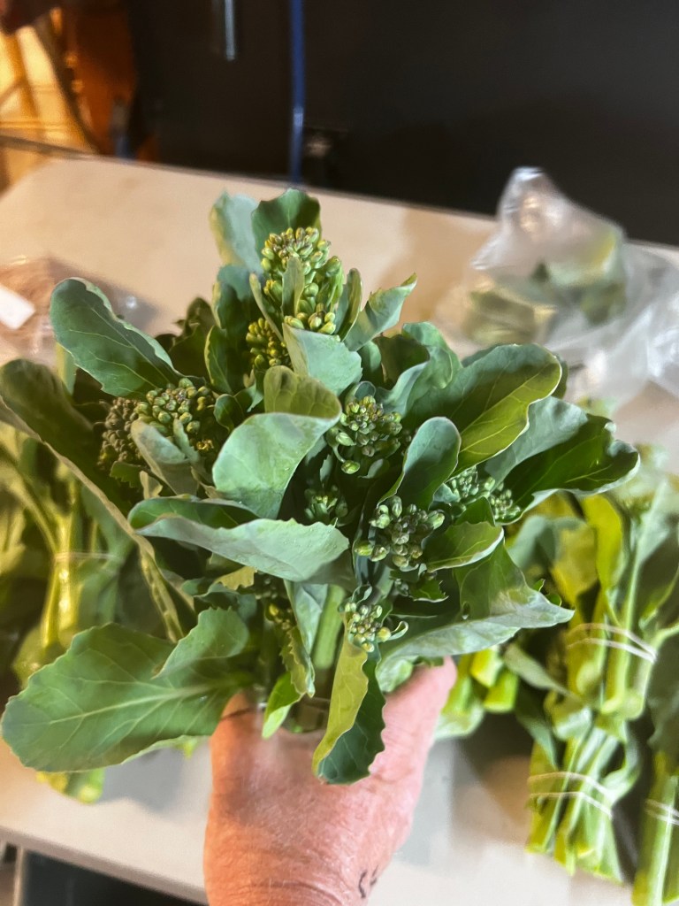Broccolini (full only)-We are enjoying this early treat. Taste just like broccoli. Love it on the grill or panfried with the garlic scapes.